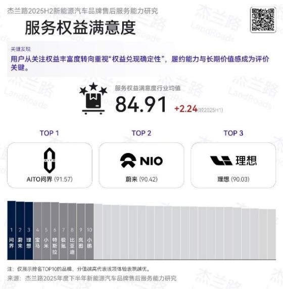 在权威调研机构杰兰路2025年度下半年新能源汽车品牌售后服务研究报告中,问界以91.57分的高分斩获服务权益满意度第一名,售后服务能力指数也跻身行业第二。这份成绩的背后,是问界摒弃了传统车企“重销售、轻售后”的弊端,打造出覆盖交付、用车、养车、出行的全生命周期服务体系。