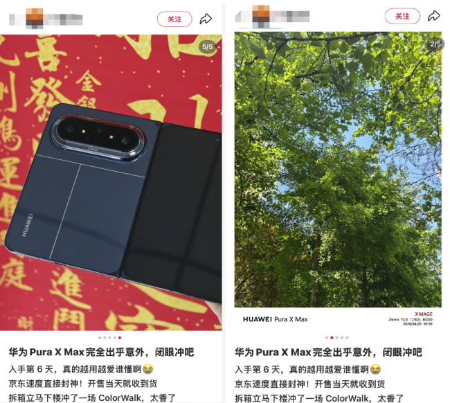 除了4月29日同步开售的华为Pura 90 Pro系列,4月25日已在京东开售的华为Pura X Max,也收获了大批用户抢先入手。不少京东首批购机消费者纷纷在社交平台分享实拍样张,沉浸式解锁城市“ColorWalk”漫游拍摄。作为横向大阔折叠旗舰,华为Pura X Max同样搭载第二代红枫原色影像与XMAGE影像体系,后置全焦段RYYB三摄组合,配备5000万像素十档可变光圈超光变主摄、1250万像素超广角与5000万像素3.5倍光学潜望长焦,全焦段色彩表现力出众。其开阔的大屏设计,不仅带来更广阔的取景视野,搭配AI智能构图、人像精修等实用功能,无论是捕捉街头小众色彩、城市远景风光,还是街角细节特写,都能精准还原自然本色,松弛拿捏治愈系街拍质感,为城市漫游与五一出行拍照带来全新体验。据京东用户反馈看,华为Pura X Max凭借出色的影像表现与综合体验,收获了极高口碑,好评率高达100%。